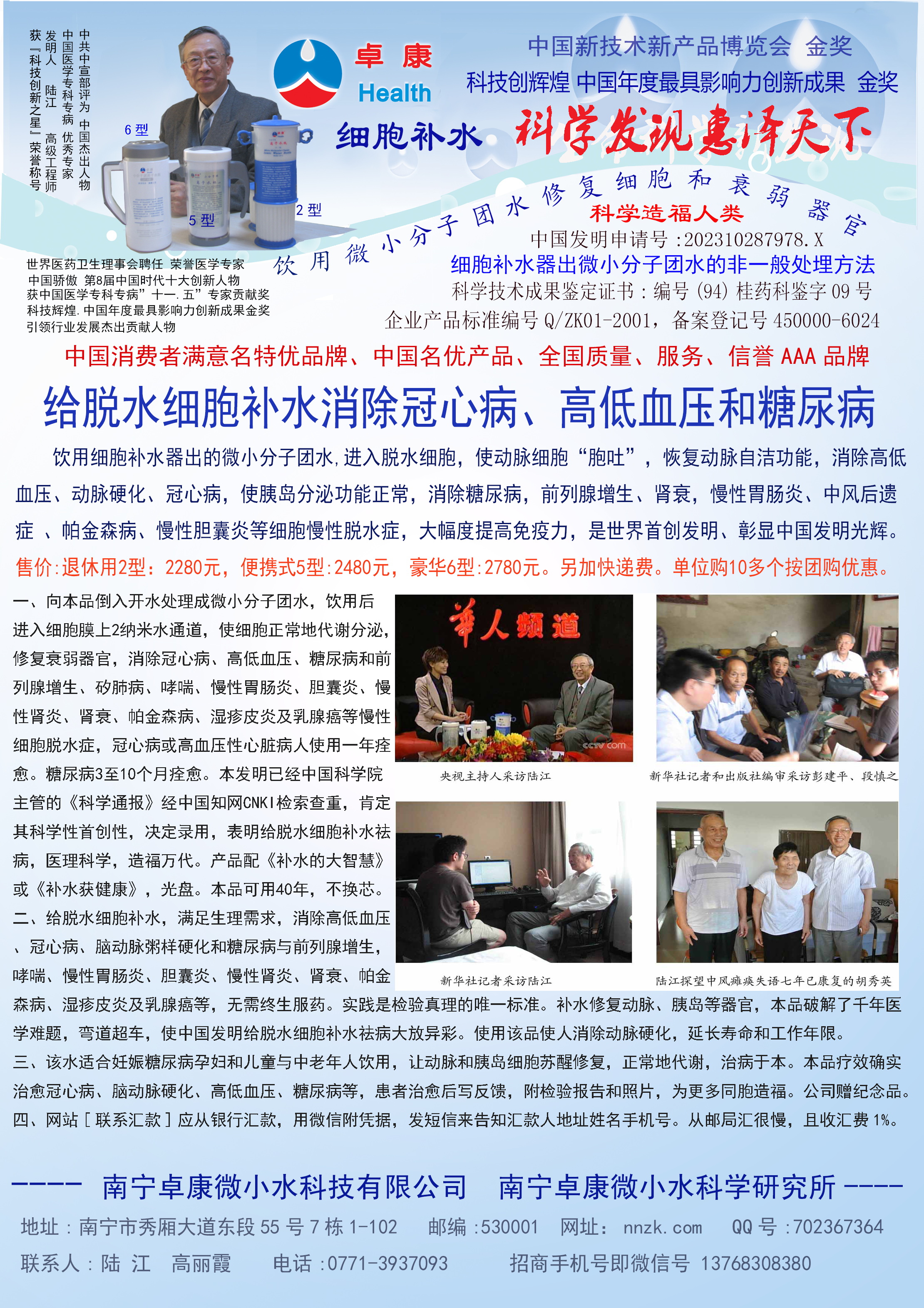 人類幾千年來患以上病癥需終生服藥,幾十年也不能治愈??墒俏覈蠈幍母呒壒こ處熽?nbsp;江,于1990年想根治高血壓,研究發明了離子水瓶,處理出微小分子團水供飲用,經過醫院臨床試用和專家鑒定,1999年獲中國發明專利權,產品于2000年投放市場后一直跟蹤調查,據全國各地用戶反饋:祛除了高低血壓、糖尿病和冠心病,并使前列腺增生、咽喉炎、鼻竇炎、慢性氣管炎、支氣管炎、矽肺病、哮喘、慢性胃炎、腸炎、慢性膽囊炎、慢性腎炎、腎衰、膀胱炎、便秘、痔瘡、風濕性關節炎和濕疹皮炎及中風后遺癥等病癥不藥而愈。為什么喝微小水能治20多種???陸 江從1991年德國科學家發現細胞膜水通道僅為2納米獲得啟發,認為多種器官患病是因細胞脫水,不能正常代謝和分裂增殖,才使器官細胞減少致衰弱萎縮而形成細胞缺水性病癥。22年來的實踐有力地支持了“細胞脫水致病”這一重要論點,表明喝微小水可滿足細胞的生理需求,補水就能祛病,是生命科學新亮點。